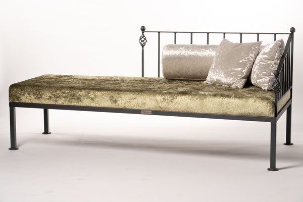 Sofa ANNA, beautiful handcrafted daybed, powdercoated, romantic style, upholstered in Germany with fine fabrics from Italy.